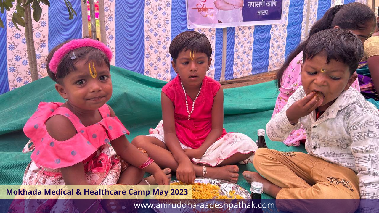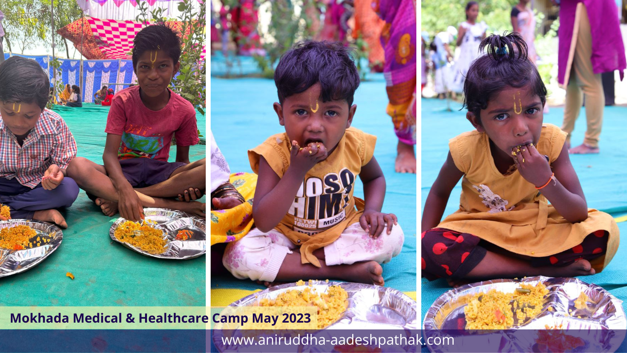 Nutritious meals are prepared and served by Shraddhavan volunteers to the underprivileged villagers and children who avail free medical services at the camp under the Annapourna Mahaprasadam initiative, a noble initiative undertaken by Dr Aniruddha Bapu.